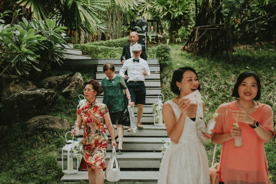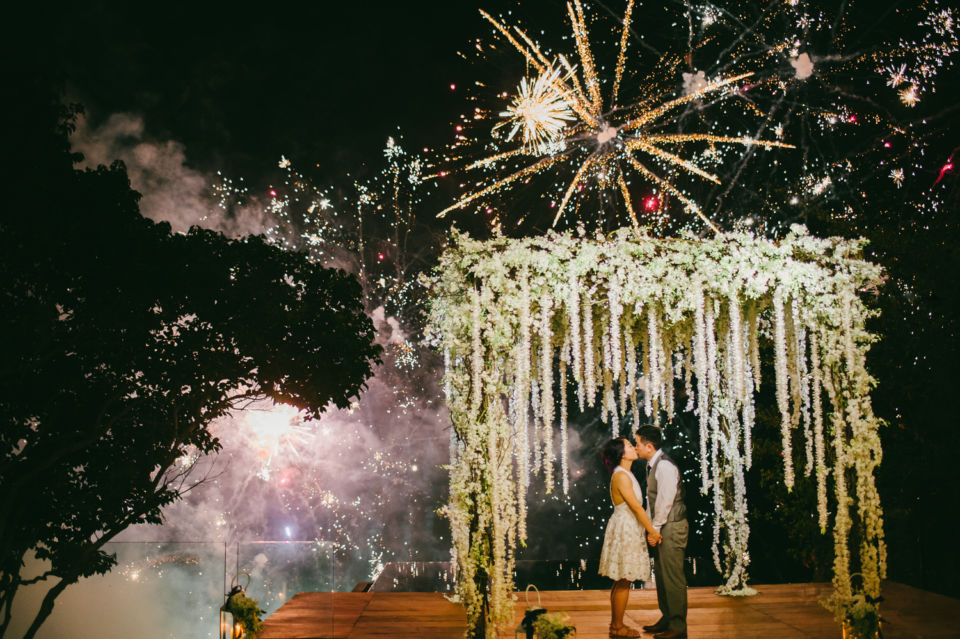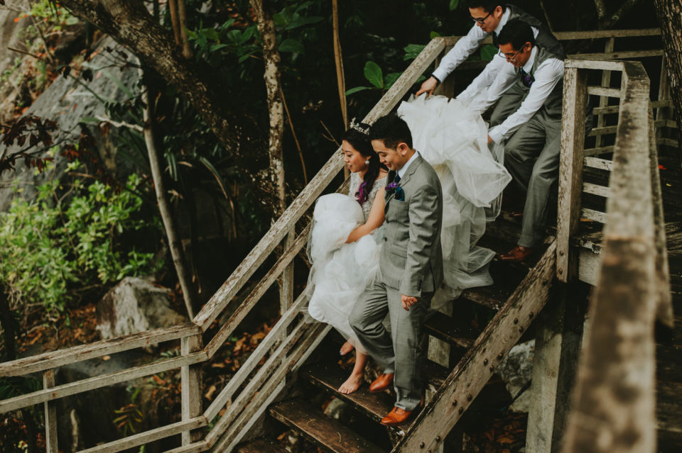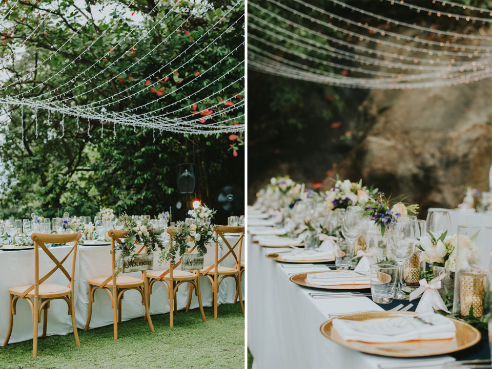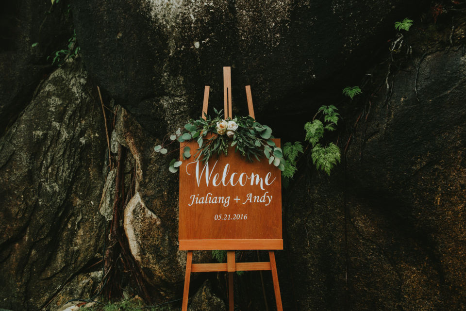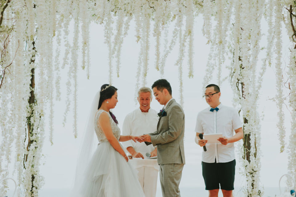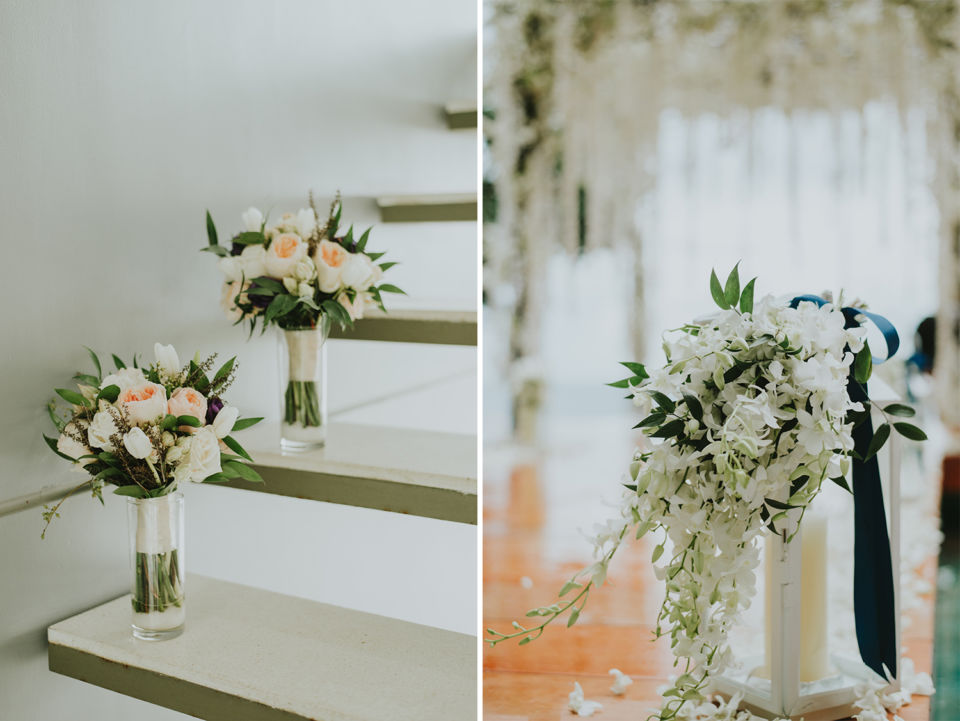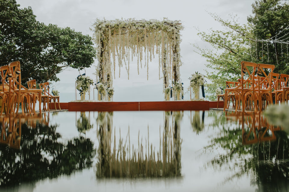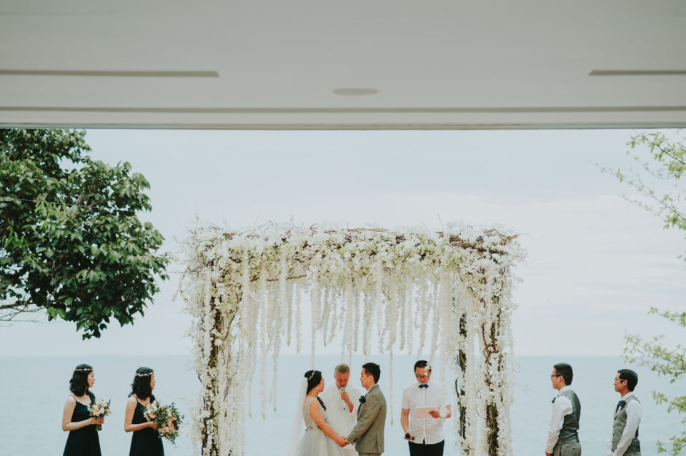 The wedding of Alex and Andy is a great example of simplicity at its best. The newlyweds met at Vanderbilt Law School, and the campus happens to be an Arboretum with thousands of trees. There weren’t thousands of tree at the wedding venue, however, the breathtaking view definitely makes up for it. The wedding ceremony was just magical, it was held on a beautiful island in Phuket, with a wooden stage built over a swimming pool for this intimate destination wedding. The stage structure was made of tree branches covered in hundreds of white orchid chains. The look was completed with white storm lanterns covered in orchids.