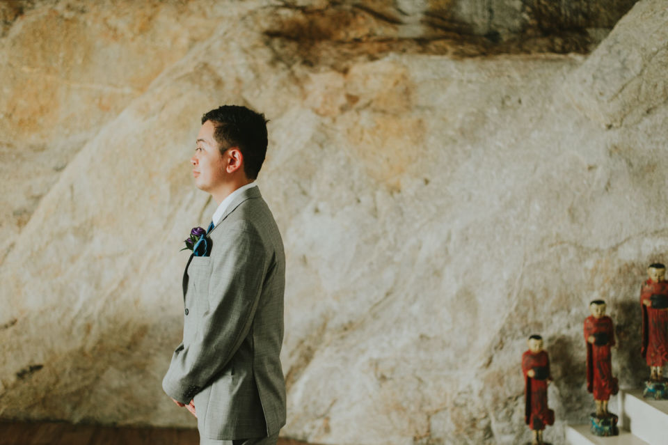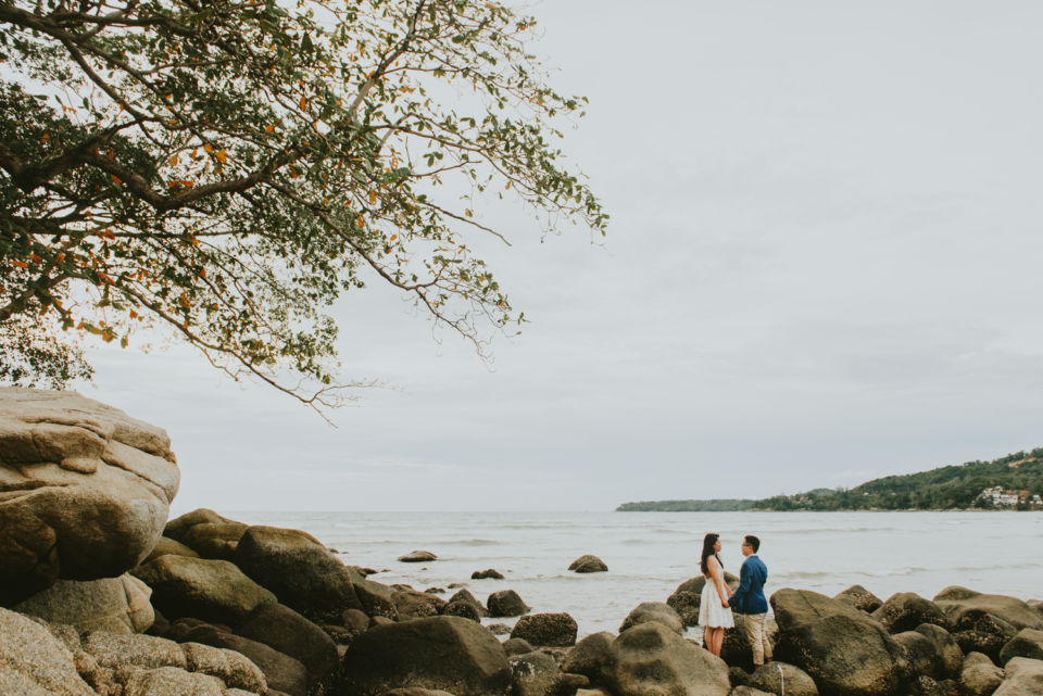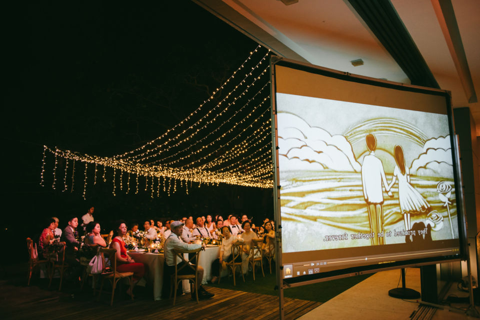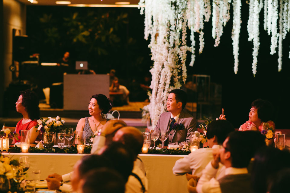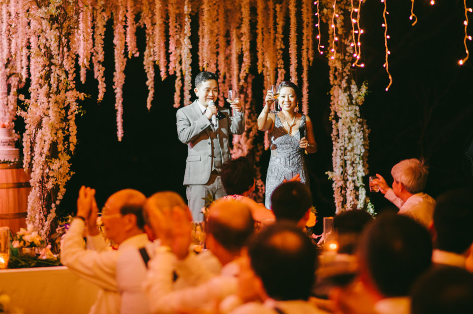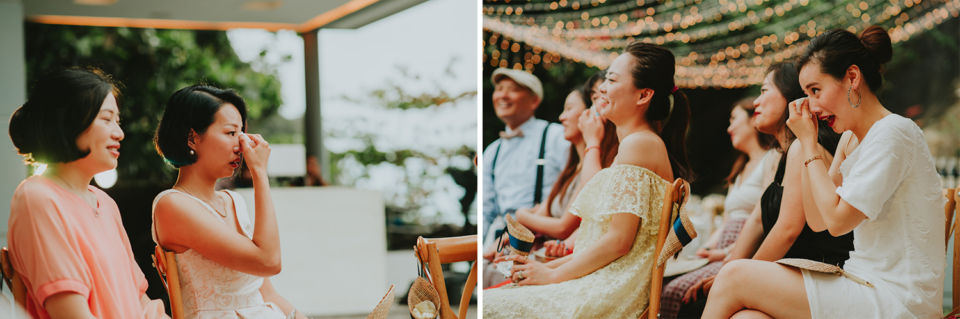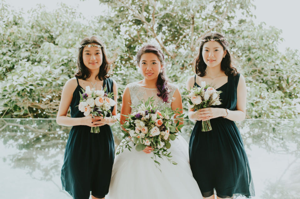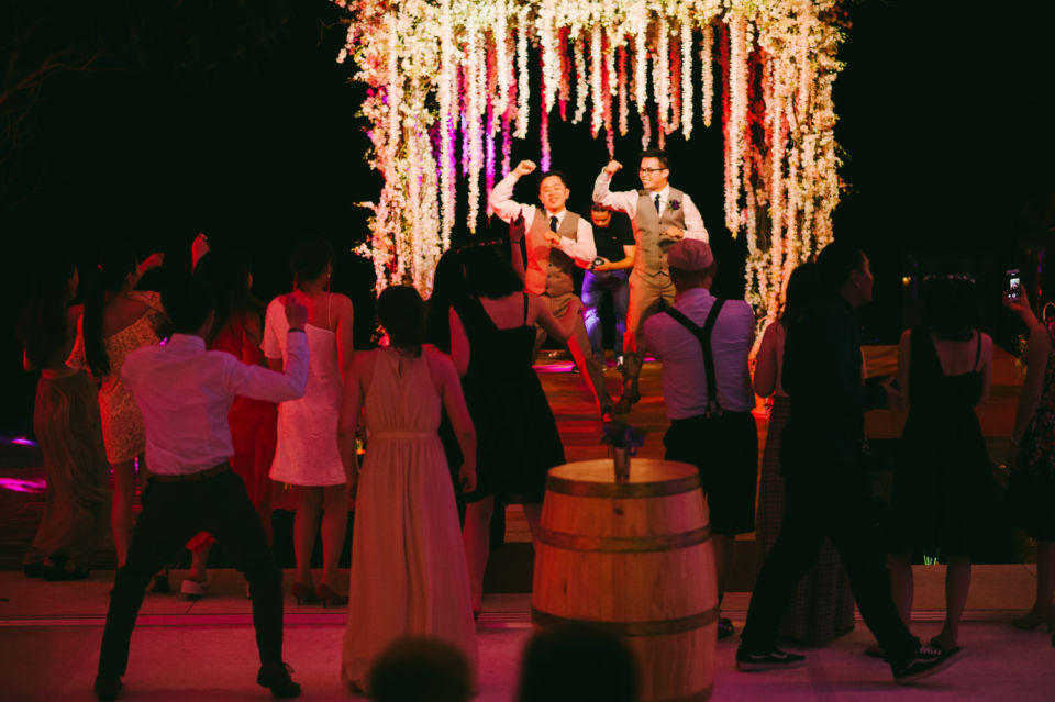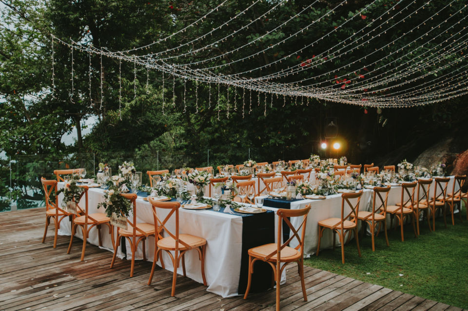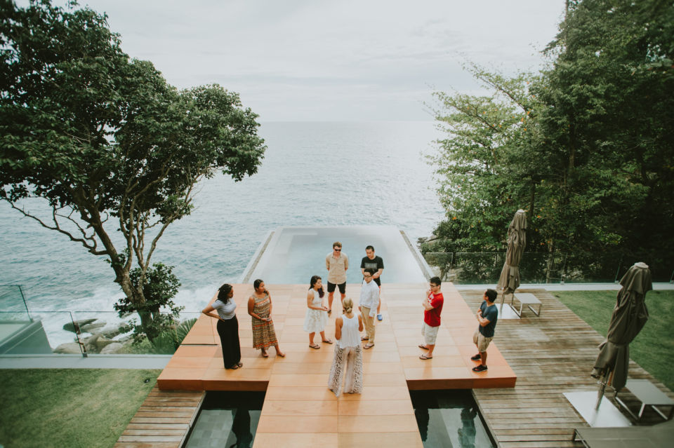 The wedding of Alex and Andy is a great example of simplicity at its best. The newlyweds met at Vanderbilt Law School, and the campus happens to be an Arboretum with thousands of trees. There weren’t thousands of tree at the wedding venue, however, the breathtaking view definitely makes up for it. The wedding ceremony was just magical, it was held on a beautiful island in Phuket, with a wooden stage built over a swimming pool for this intimate destination wedding. The stage structure was made of tree branches covered in hundreds of white orchid chains. The look was completed with white storm lanterns covered in orchids.