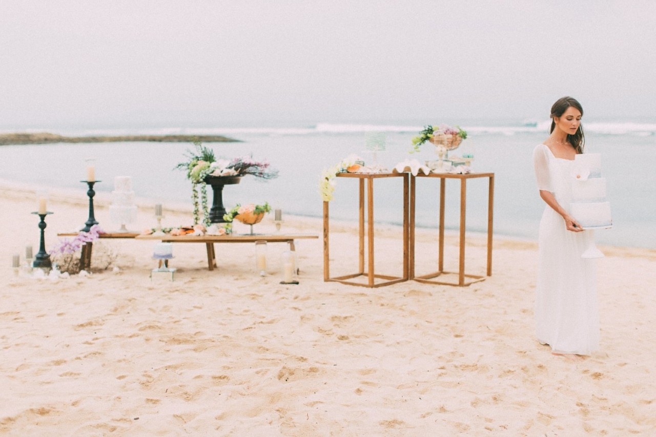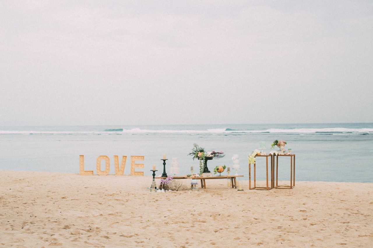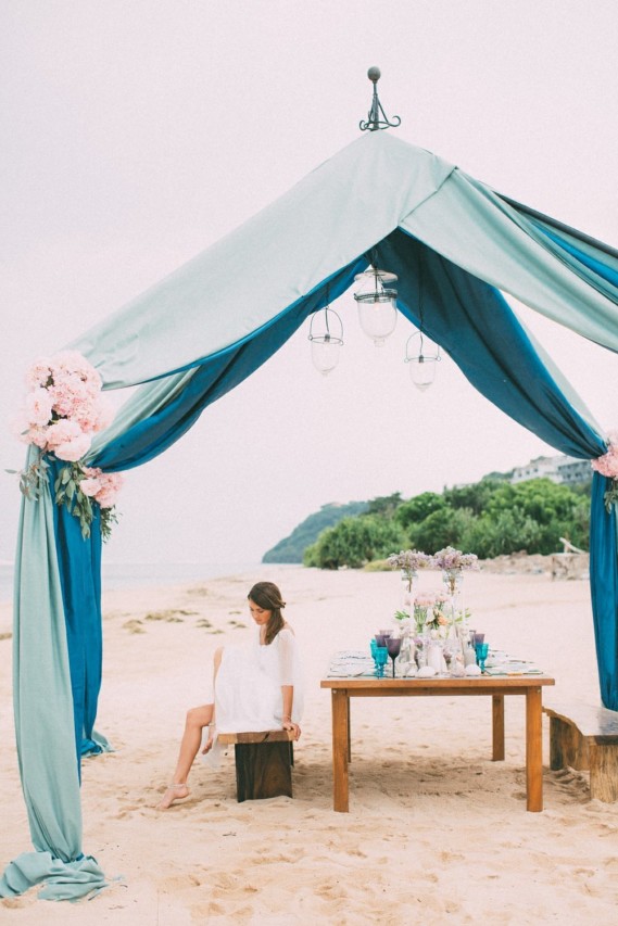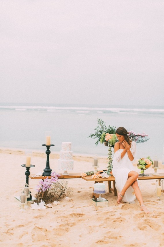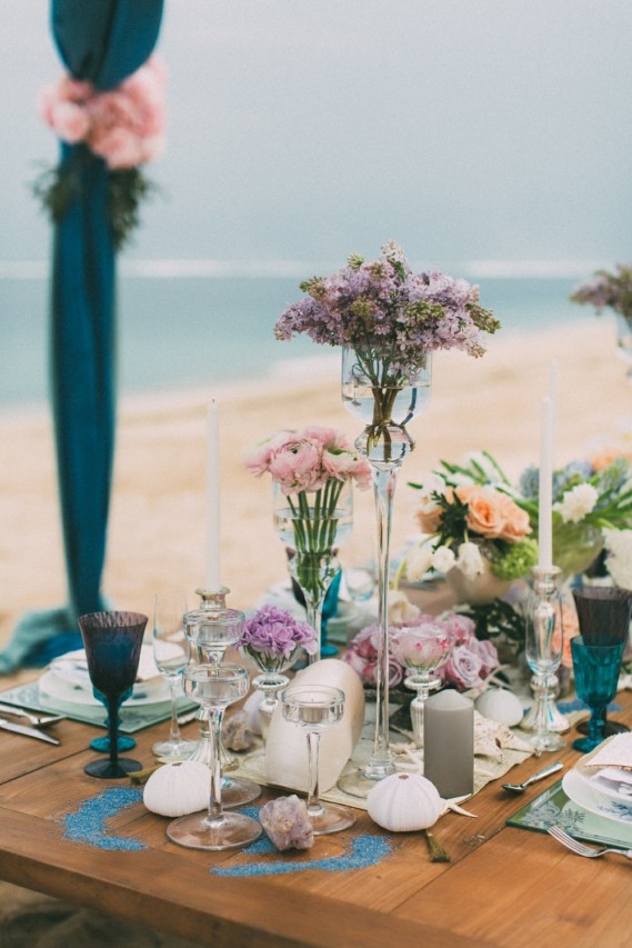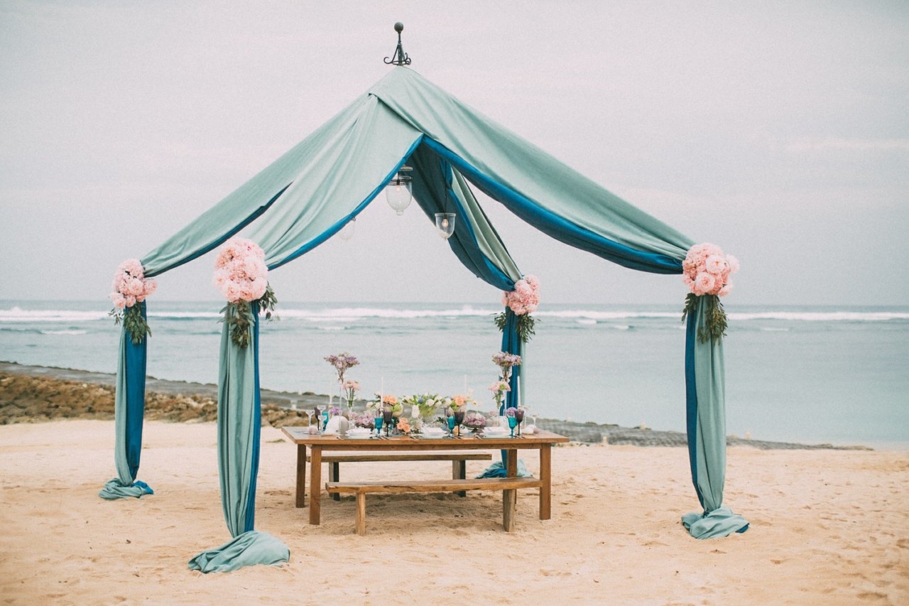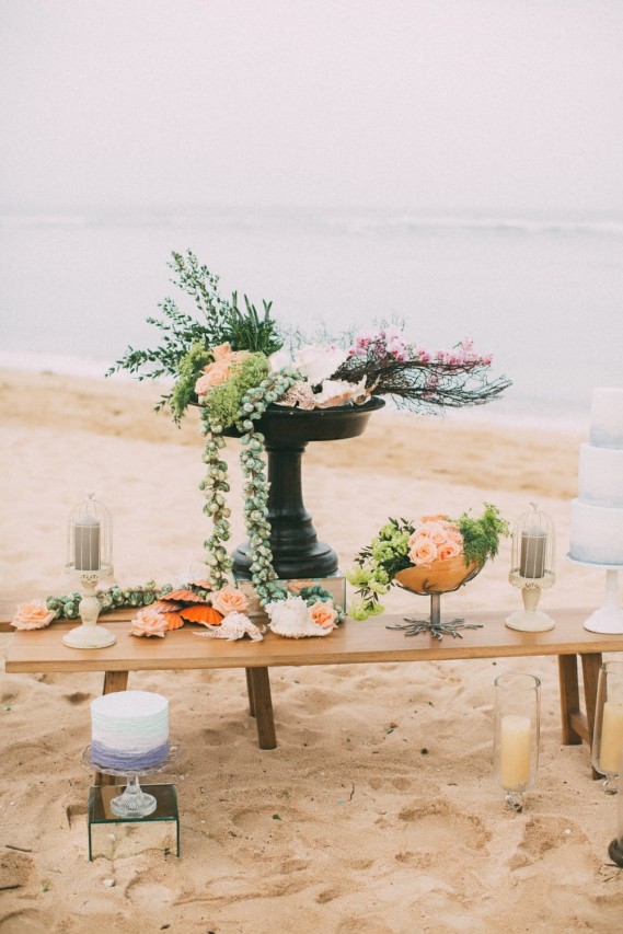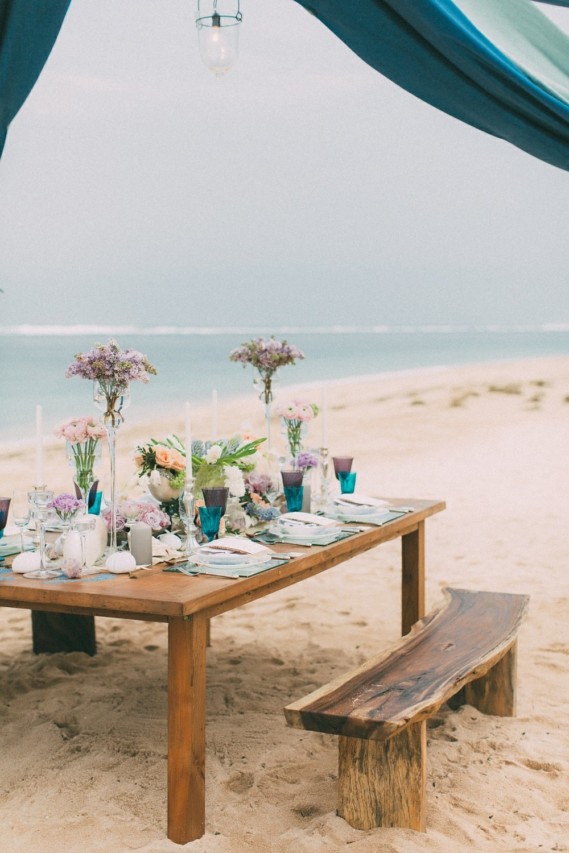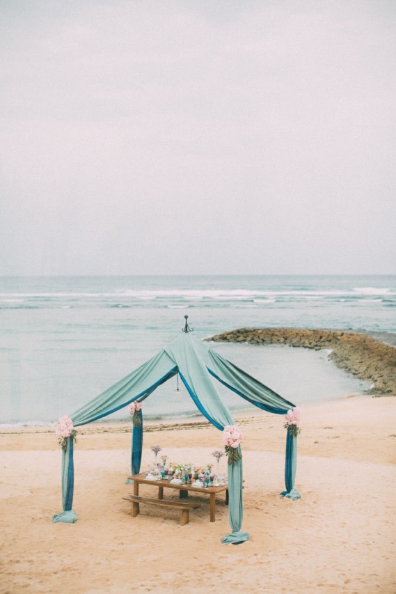 Inspired by all things romantic, this bohemian styled wedding inspiration at Ritz Carlton Bali is for the boho brides and beach babes. We have fallen in love with, the sheer tulle ivory draping like tent, a chandelier hanging in the middle set on the beach and a rustic wooden table covered with a linen runner. As for decor there are oceanic decor and textures, corals, shells, oyster shells, crystals and raw amethyst that go down the aisle, plus single blooms and a variety of candles. We just can’t get enough of the idea of an intimate beach wedding – and the ceremony structure is great inspiration for any beach wedding!