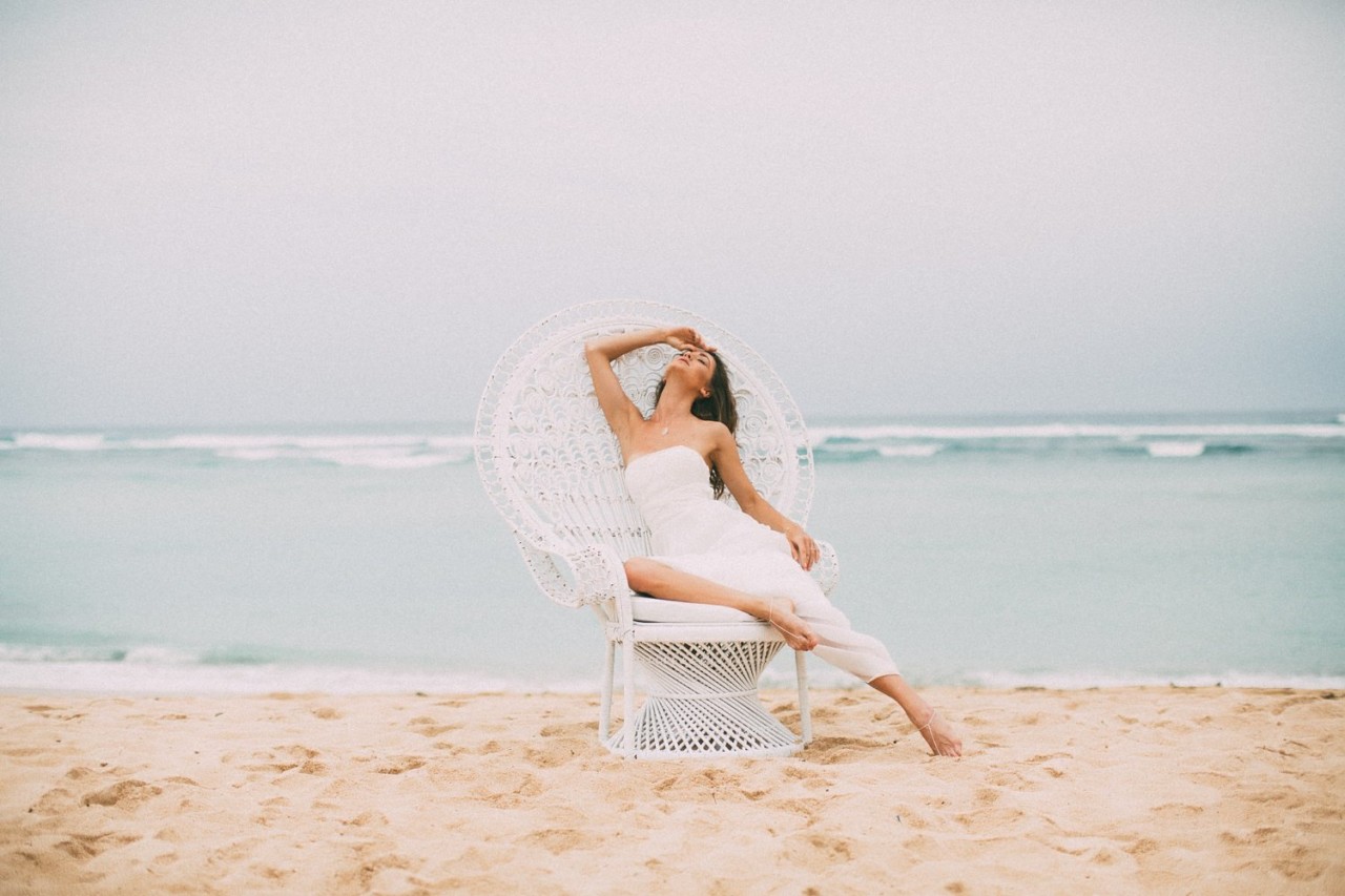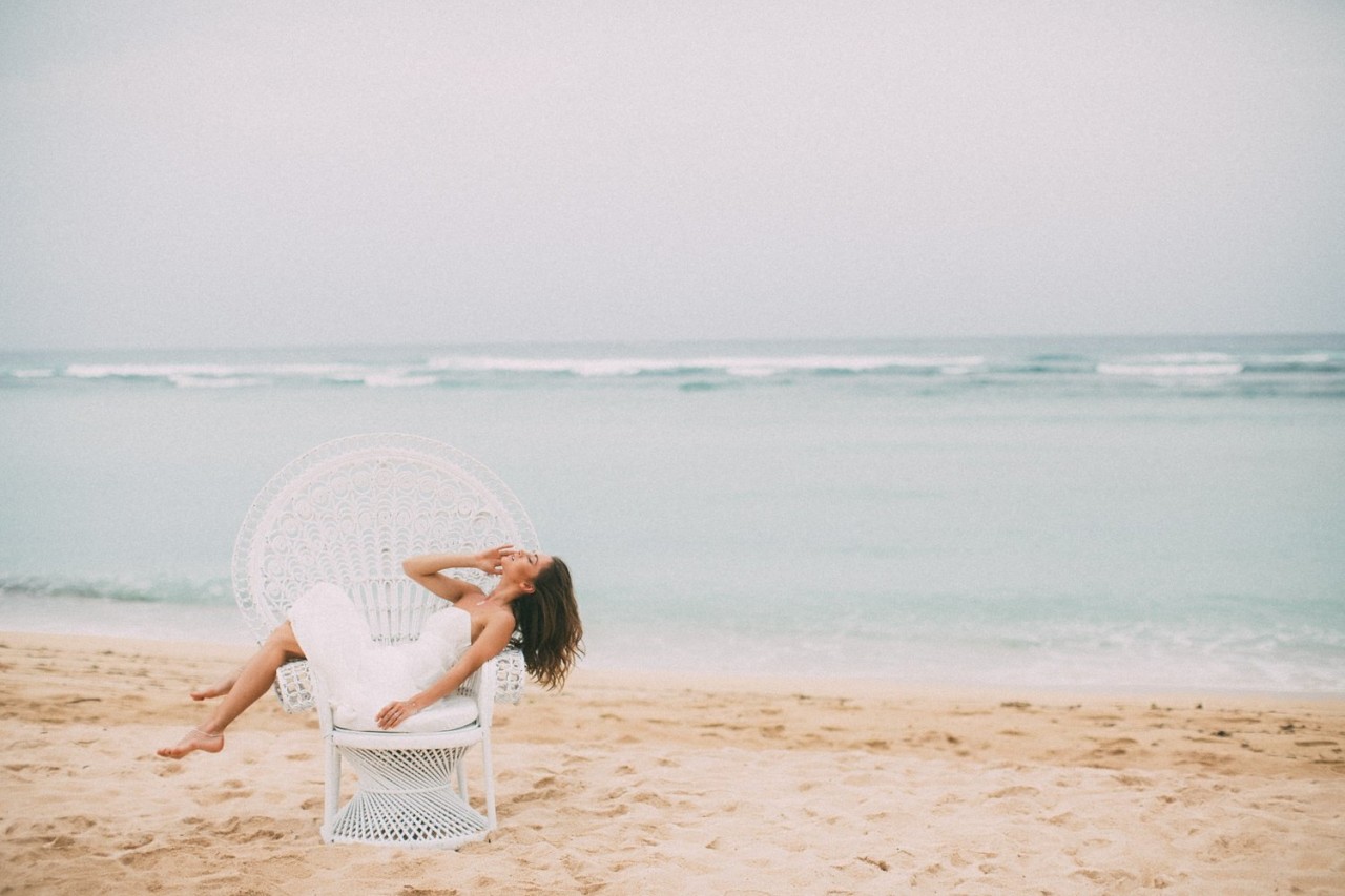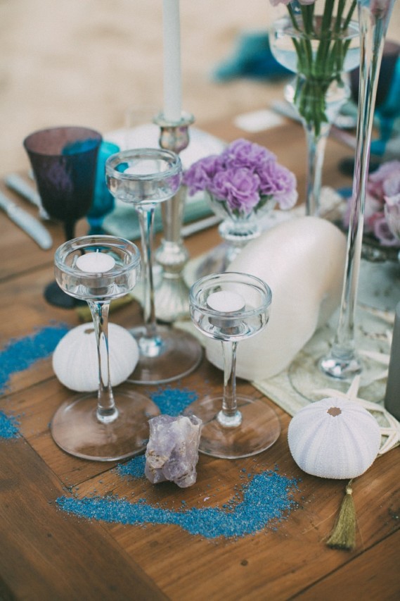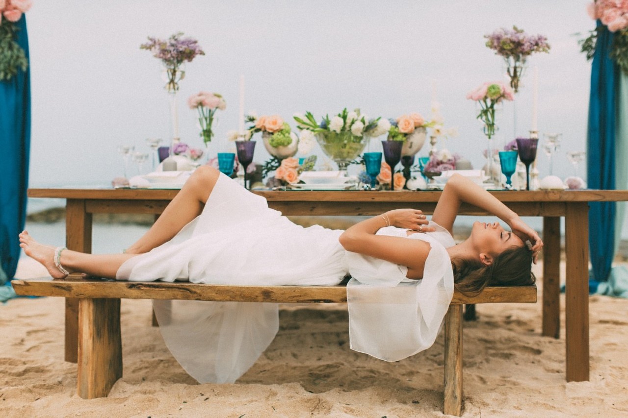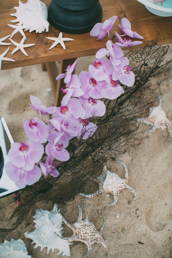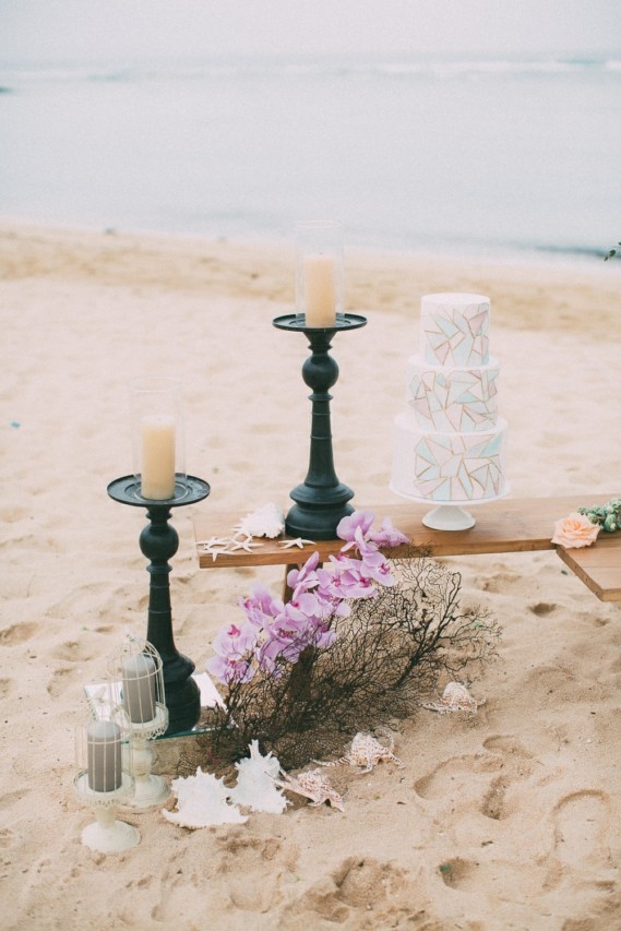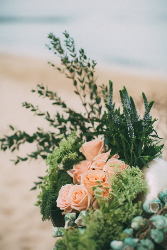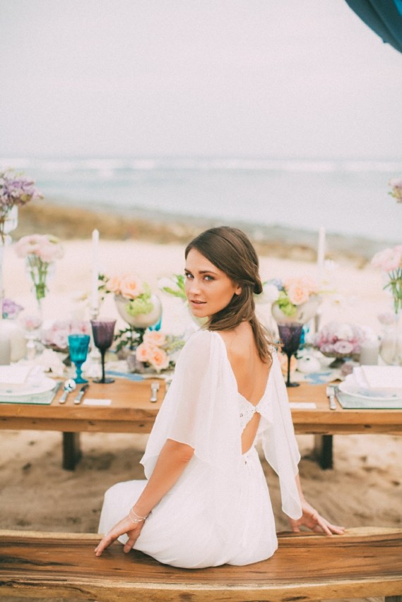 Inspired by all things romantic, this bohemian styled wedding inspiration at Ritz Carlton Bali is for the boho brides and beach babes. We have fallen in love with, the sheer tulle ivory draping like tent, a chandelier hanging in the middle set on the beach and a rustic wooden table covered with a linen runner. As for decor there are oceanic decor and textures, corals, shells, oyster shells, crystals and raw amethyst that go down the aisle, plus single blooms and a variety of candles. We just can’t get enough of the idea of an intimate beach wedding – and the ceremony structure is great inspiration for any beach wedding!
