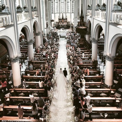 Indonesian sweethearts, Ralph Glenn Alinskie and Gabrielle Chelsea Olivia Wijaya’s big day, was and still is one of the most epic and luxurious fairy-tale wedding to date. Held at the Hotel Mulia Senayan, Central Jakarta, the couple stunned wedding guests, fans and followers after they unveiled a ceremony that featured swans, unicorns and a 4.5-metre highly-detailed edible white wedding cake completed with towers, flags and a pair of heart-shaped stairs – looking like it came straight out of a Disney cartoon. Chelsea Olivia Wijaya’s wedding gown on the other hand, was a embellish lavish ball gown designed by Jakarta-based couturier, Hiantjen, complete with a diamond tiara. The pair exchanged their marriage vows at the Church of Santa Maria Patron of the Assumption.