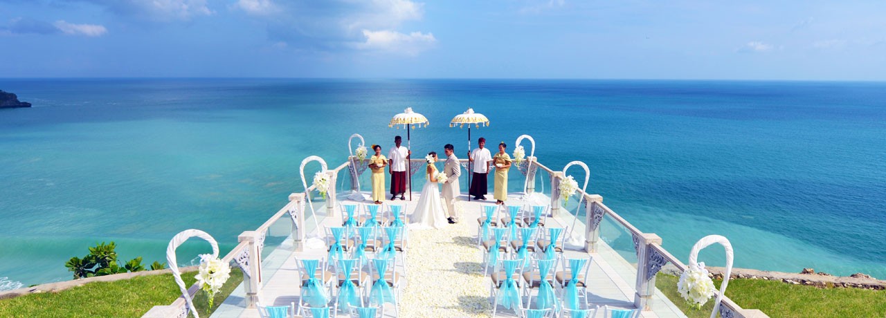 SKY is definitely not the limit at Ayana Resort. The dramatic open-air design features ceremonial steps and multi-tiered fountains that ascend to a cantilevered deck extending 3.5 meters out from the cliff, where couples feel on top of the world as they exchange vows at eye level with the horizon.