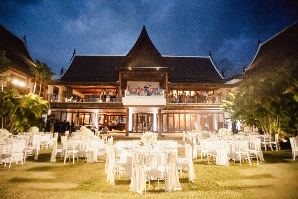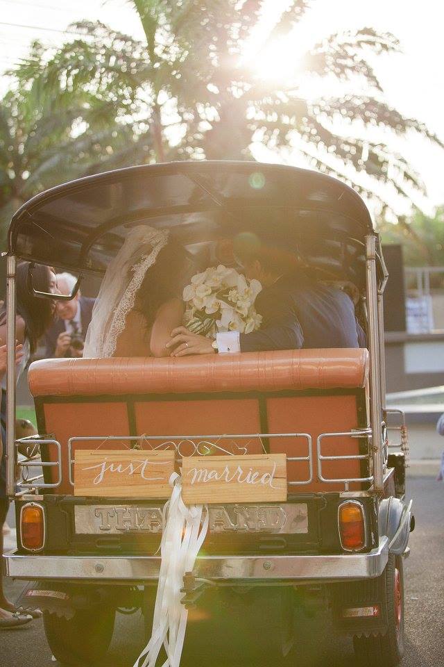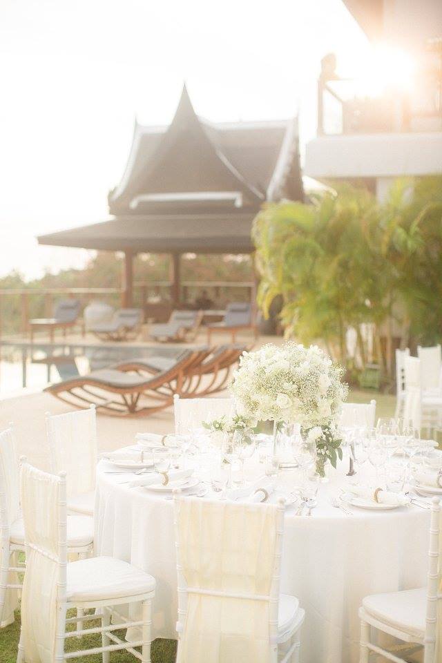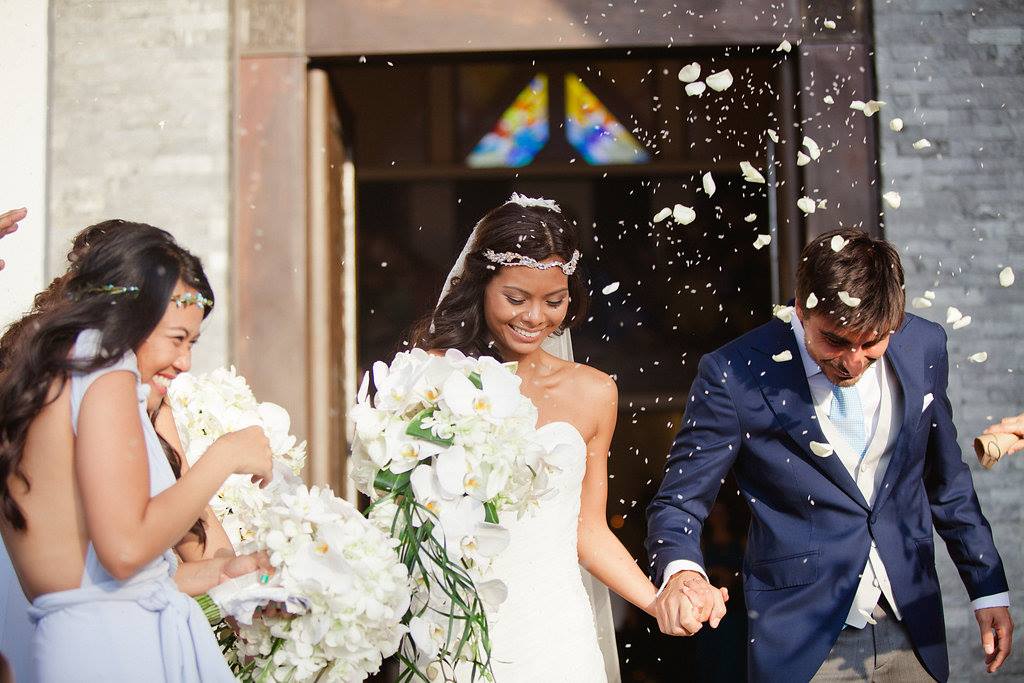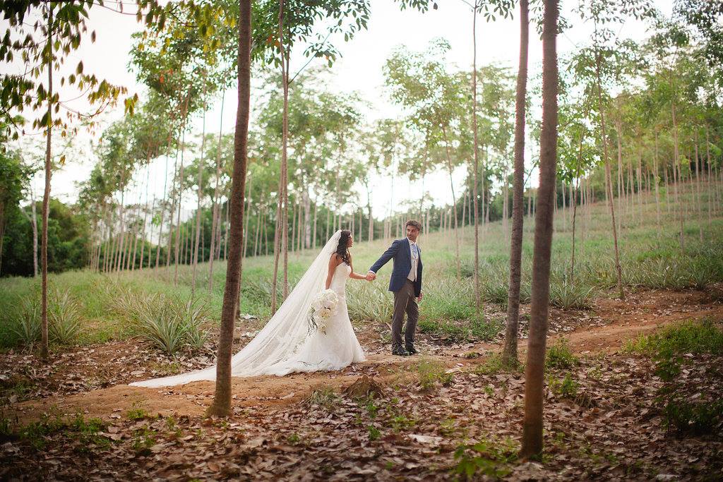 Diane and Giacomo decided on a traditional church ceremony to respect the Italian Catholic tradition of Giacomo’s home country. The simple church interior was complemented with arrangements of native to Thailand orchids, which added a “destination” element into this tradition. As the bride and the groom walked out from the church showered with rice and flower petals, they further made their way into their “Just Married” tuk-tuk — a traditional Thai carriage typically used as a local taxi. With this cute and authentic transport, they set off for a portrait shoot in a rubber plantation nearby. Continuing the celebration of Diane and Giacomo’s union, the couple headed to a private villa with stunning Andaman sea view for their wedding reception.