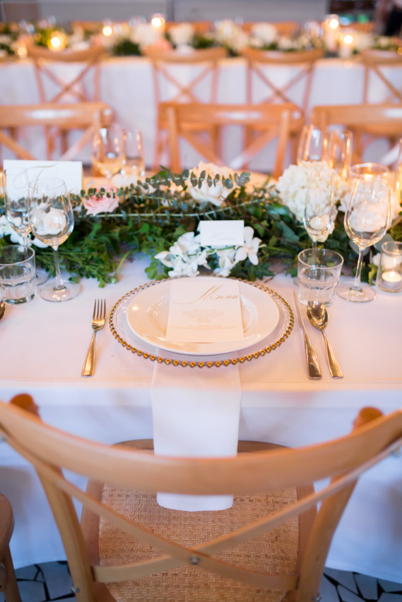 The wedding theme was dreamy & forestry with a lot of white and touch of blush : At the ceremony, there is a 3m tall arch made from two big trees joining at the center complimented by white floral aisle and natural crossed back wooden chairs. Greenery bush with white and blush flowers centerpiece on dinner tables with white hanging on the ceiling.