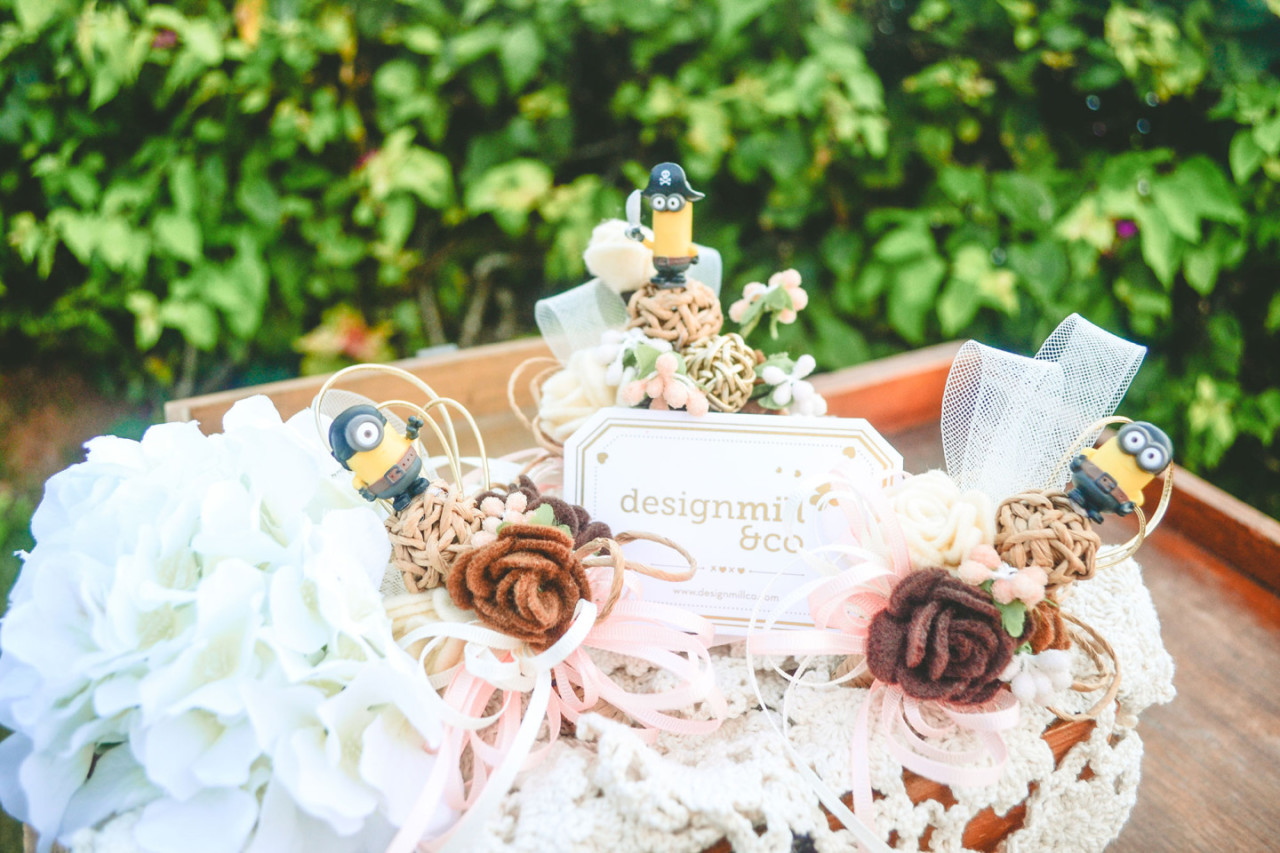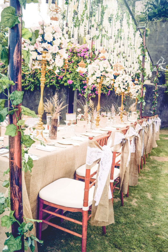 “The weather was thankfully bright and warm on the day of Titov and Patricia’s wedding. The blue sky served as the perfect backdrop to the couple’s preferred theme that combined rustic mood with story book-inspired forest. “We, as always, were thrilled to hop on the love bandwagon, and took the task to the heart. With extra imagination and hard work, we searched seasonal flowers to create exquisite arrangements for both the matrimony and reception,” says DesignMill & Co. Branches, wood and even stones were used in the decoration to add elements of wilderness, softened by the vibrant colours of flowers. A slight touch of rustic gold as well as hanging glass balls gave one last whimsical magic to the setting.