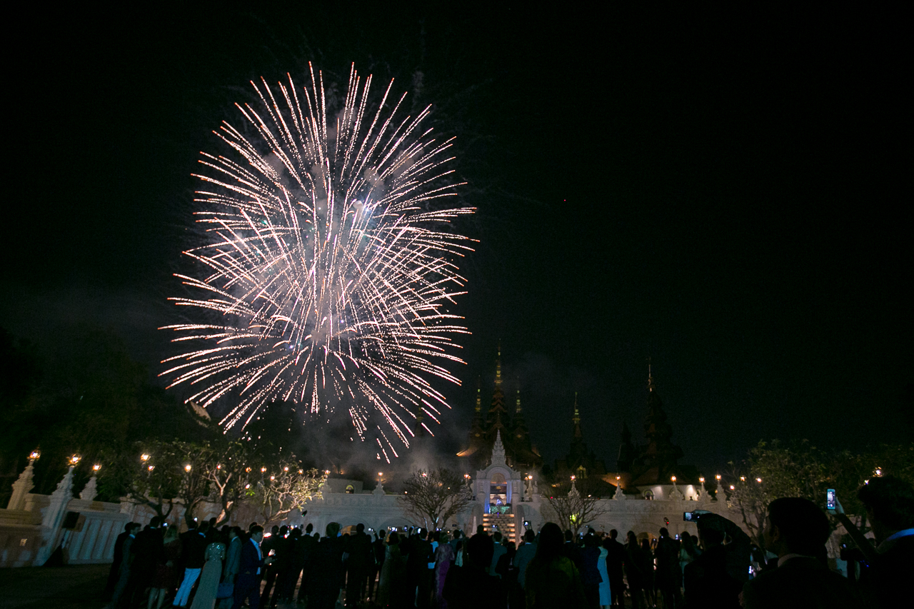 Adding just one more surprise for the guests, the team worked very hard on an enormous reception set-up for the evening wedding celebration. A large truss construction as raised above Dhara Dhevi Chiang Mai’s spacious grass lawn, serving as a frame for decorative drapings and lights. The focal points of the whole space and main decorative elements were 3 massive floral chandeliers above the dining table. The end results was the fruition of thousands of hours of labour, day and night in the past weeks leading up the day.