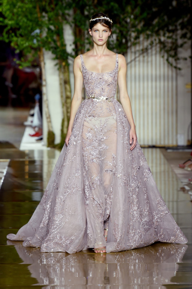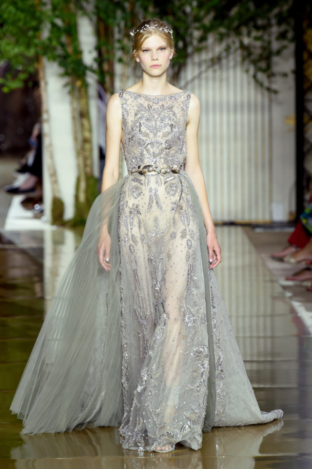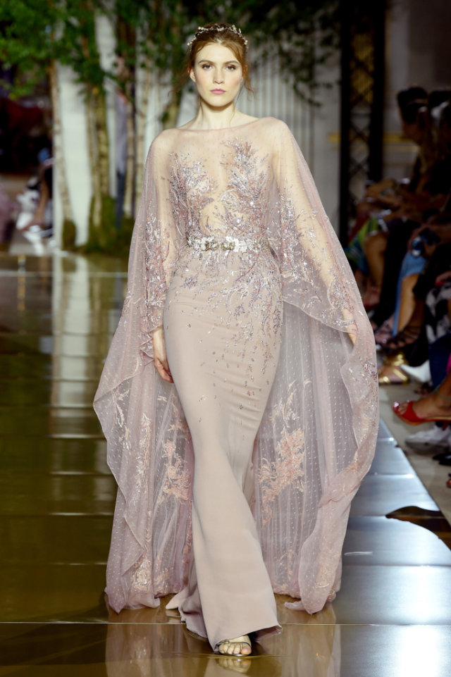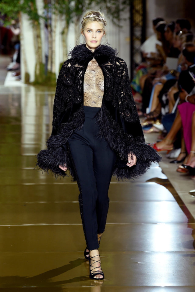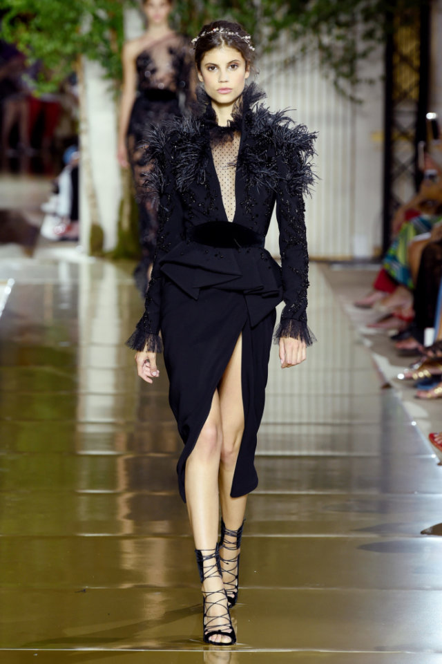 Zuhair works up his signature super-sheer nudes with strategically placed metallics embroidery in gold, silver and rose gold to sensuous effect. The show opens with dresses and pantsuits in black laces and velvets, structured shoulder lines, plunging necklines and playful play of ostrich feathers and tassels. Zuhair Murad’s Couture Fall 2017 /2018 is an evocation of women both beautiful and independent.